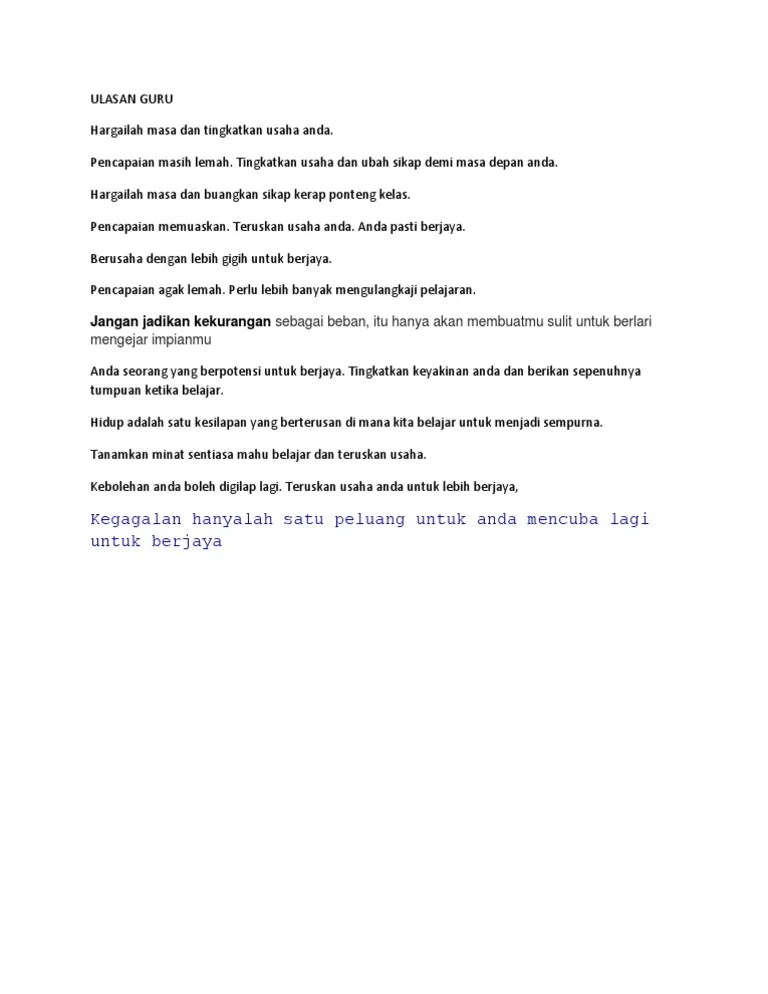 Anda mesti mempunyai motivasi yang tinggi dan minat terhadap pelajaran di dalam kelas. Pencapaian sederhana atau ulasan umum 1. Tingkatkan usaha dan ubah sikap demi masa depan anda. Banyakkan mengulangkaji pelajaran dan latihan di rumah. 55, 1, guru kelas perlu memberi ulasan tentang kebolehan,usaha, sikap dan nilai murni bagi setiap murid dalam kelasnya secara deskriptif.